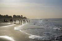 Een groep vissers probeert de net uitgegooide netten met vereende kracht het strand op te trekken in Gambia