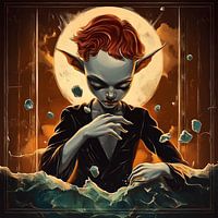 Een mystieke figuur met vurig rood haar en scherpe elfentrekken staat op onder een gloeiende volle maan, haar handen glijden sierlijk door zwevende scherven turkooizen steen. Geheel in het zwart gekleed straalt ze elegantie en kracht uit, alsof ze werelden creëert uit fragmenten van magie en herinnering. Het spel van licht en schaduw…