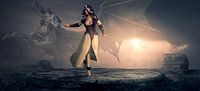 Dit digitale kuntwerk laat een vrouw zien in een mythologie. Achter de mythologische meid staat een gevaarlijke draak met zijn vleugels gespreid.