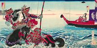 Toyohara Kunichika (1835-1900) was een belangrijke Japanse ukiyo-e kunstenaar uit de 19e eeuw. Hij is vooral bekend om zijn kleurrijke houtsneden en portretten van kabuki-acteurs, sumoworstelaars en schoonheden. Kunichika was een meester in het ukiyo-e genre, dat de vluchtige genoegens en het alledaagse leven van de Edo-periode (17e tot 19e eeuw) in Japan vastlegde. Zijn werken worden gekenmerkt door de levendige weergave van gezichtsuitdrukkingen en kostuums, waardoor de persoonlijkheid van de afgebeelde personen tot leven komt. Kunichika maakte ook series houtsneden, vaak met verhalen uit beroemde toneelstukken of historische gebeurtenissen.