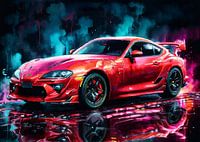 Een Toyota Supra Turbo in neon waterverf brengt de legendarische rondingen en kracht van de auto tot leven met levendige, gloeiende kleuren. De neonkleuren benadrukken het gedurfde, op tuners geïnspireerde ontwerp, terwijl de zachte, vloeiende penseelstreken van aquarel een energieke, futuristische vibe toevoegen aan zijn iconische aanwezigheid.