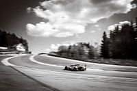 Toyota TS050 Hybride raceauto in Eau Rouge tijdens de 2016 Six Hours of Spa van het FIA World Endurance Championship op het circuit van Spa-Francorchamps. Zwart en wit beeld met sterke bewegingsonduidelijk beeld.