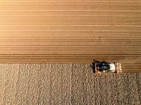 Tractor bereidt de grond voor op het planten van gewassen tijdens een zonnige en droge lentedag. Luchtfoto drone view van recht boven.