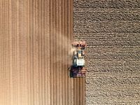 Tractor bereidt de grond voor op het planten van gewassen tijdens een zonnige en droge lentedag. Luchtfoto drone view van recht boven.