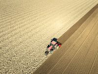 Tractor die de grond bewerkt in de lente van bovenaf gezien tijdens een zonnige en droge lentedag. Luchtfoto vanuit een drone gezien van recht boven.