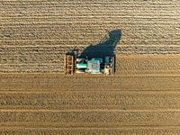 Tractor die de grond bewerkt in de lente van bovenaf gezien tijdens een zonnige en droge lentedag. Luchtfoto drone gezien van recht boven.