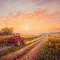 Een roodgeverfde tractor staat trots op een platgetreden pad dat zachtjes door de gouden velden loopt. De zonsopgang baadt de lucht in een warm spel van oranje en roze kleuren, terwijl de zachte wolken op penseelstreken lijken. Hier smelten natuur en mens samen in harmonieuze stilte, klaar voor een nieuwe dag vol mogelijkheden.