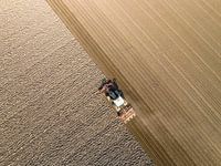 Tractor die de grond voorbereidt voor het planten van gewassen tijdens een zonnige en droge lentedag. Luchtfoto dronezicht van recht boven.