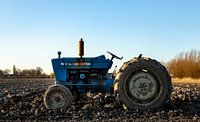 Close-up van een tractor op het Zeeuwse land met het warme ochtendlicht