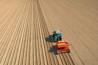 Tractor plant pootaardappelen in voorbereide grond voor het planten van gewassen tijdens een zonnige en droge lentedag. Luchtfoto drone view van recht boven.