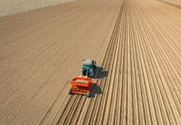 Tractor plant pootaardappelen in voorbereide grond voor het planten van gewassen tijdens een zonnige en droge lentedag. Luchtfoto drone view van recht boven.