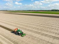 Tractor plant pootaardappelen in voorbereide grond voor het planten van gewassen tijdens een zonnige en droge lentedag. Luchtfoto drone zicht van boven.