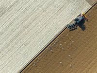 Tractor ploegt de grond voor het planten van gewassen tijdens een zonnige en droge lentedag. Luchtfoto vanuit een drone, recht van boven.