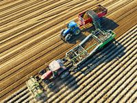 Aardappelrooien op een veld waar één machine de aardappelen opraapt en in een aanhangwagen laadt die getrokken wordt door een tractor die naast de rooier rijdt.