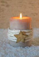 Traditioneel brandende advents- en kerstkaars versierd met gouden ster op sneeuw; kerstkaart, kerstversiering, kerstdecoratie, wenskaart, kerstverlichting