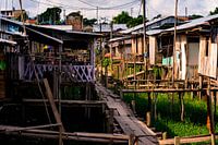 Deze prent is van een traditioneel op palen gebouwd dorp in het regenwoud van de Amazone in Peru. De houten huizen staan dicht op elkaar en vormen een hechte gemeenschap. We zien de huizen van de achterkant, verbonden door houten weggetjes.