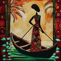 Dit prachtige schilderij van een traditioneel geklede Afrikaanse vrouw die aan het vissen is, is als een venster naar een andere wereld. De kunstenares is erin geslaagd om in een gepassioneerde expressionistische stijl met verbazing en verrukking een portret van de Afrikaanse cultuur te schilderen dat zo levendig is dat het lijkt alsof je de zoute zee kunt ruiken en de golven kunt horen slaan. In haar geschilderde wereld is het leven eenvoudig en gebaseerd op de basis van wat echt belangrijk is - vissen om eten op tafel te krijgen. Het schilderij herinnert ons eraan dat onze wereld voortdurend verandert en vraagt ons een stap terug te doen om na te denken over de essentie van het leven.