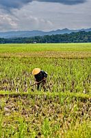 Deze krachtige en authentieke foto illustreert het dagelijkse werk van een Indonesische boer in de uitgestrekte rijstvelden van Pangandaran, op het eiland Java. Gebogen onder zijn strooien hoed bewerkt hij zijn velden met de precieze gebaren die hij van generaties boeren heeft geërfd. De ondergelopen, groene rijstvelden strekken zich uit zover het oog reikt en vormen een levende lappendeken aan de voet van de mistige bergen. De bewolkte lucht zorgt voor een zacht licht dat de diepte van het landschap versterkt en het contrast tussen de menselijke inspanning en de natuurlijke onmetelijkheid onderstreept. Deze scène benadrukt de fragiele harmonie tussen de mens en zijn omgeving, waar elke rijstkorrel de vrucht is van geduld, vaardigheid en respect voor het land. Dit beeld is meer dan alleen een landbouw momentopname, het vertelt het verhaal van een voorouderlijke manier van leven die nog steeds miljoenen families voedt. Het is ook een herinnering aan het vitale belang van de rijstteelt in Indonesië, niet alleen als voedselbron, maar ook als een diepgeworteld cultureel en spiritueel symbool.