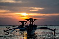 Traditionele Balinese boot (Jukung) bij zonsondergang op Bali Indonesië