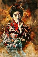 Digitaal mixed media kunstwerk van een traditionele Japanse geisha zittend op een stoel.