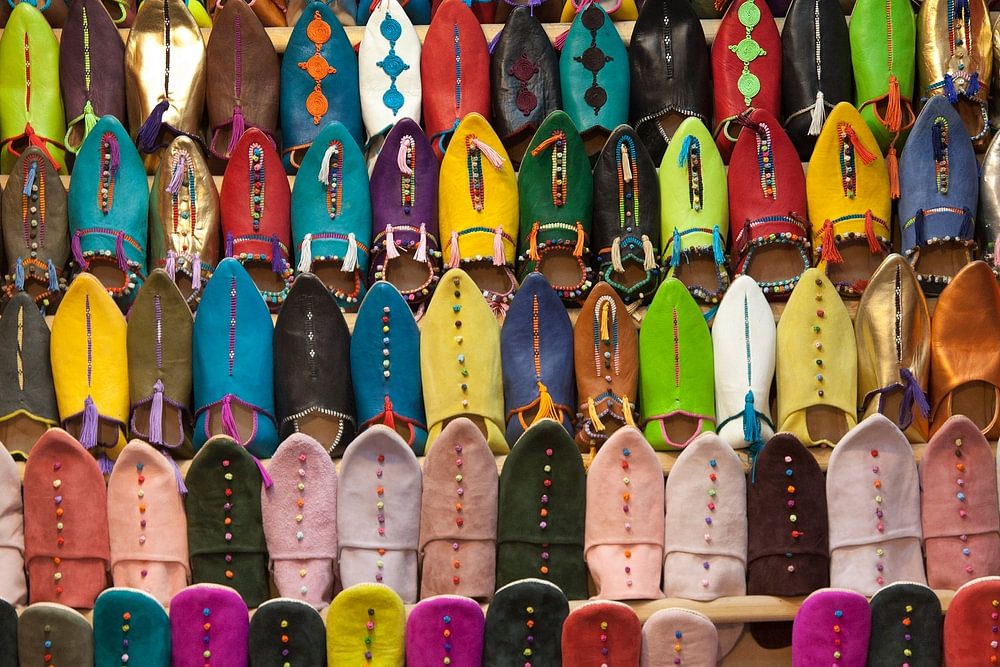 Kleurrijke traditionele Marokkaanse slippers, babouche, te koop in de souk in Marrakesh