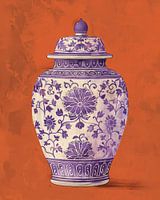 De vaas heeft een crèmekleurige basis met complexe paarse en lila designs. Bovenaan is een knobbelvormige deksel, waardoor het ontwerp compleet aanvoelt. Er zijn verschillende bloemmotieven, waaronder grote bloemen met delicate bladeren en ranken die het oppervlak sieren. De decoraties vertonen een klassieke stijl, met subtiele lijnen en patronen die een tijdloze kwaliteit uitstralen. De achtergrond is een warme oranje kleur, wat de witte porseleinbasis en paarse patronen accentueert.