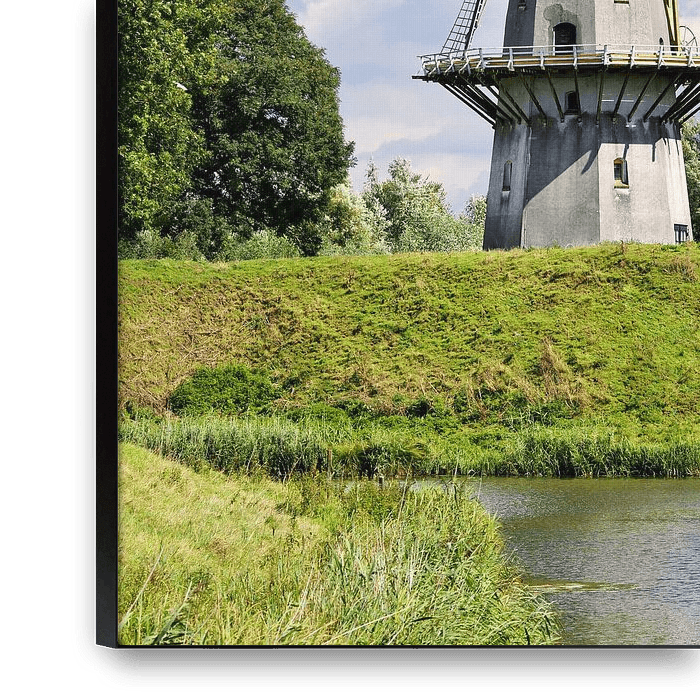 Traditionele Nederlandse windmolen op een dijk in de buurt van een kanaal op een zonnige dag met blauwe hemel en dramatische wolken