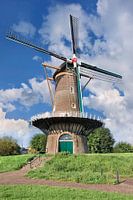 Traditionele Nederlandse baksteenindustrie windmolen op een dijk tegen een zonnige blauwe hemel met dramatische wolken