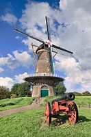 Traditionele Nederlandse windmolen op met een oude rode canon vooraan op een zonnige dag met een blauwe bewolkte hemel
