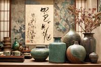 Traditionele oosterse kunst: Traditionele keuken scène met handgemaakt aardewerk, kalligrafie, en gloeiende washi scherm achtergrond