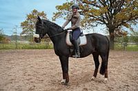 Training met het Beierse zwarte paard Baveria op een rijbak in de herfst