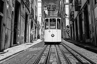 Elevador da Bica, de historische kabelbaan in Lissabon, gefotografeerd vanuit kikkeroogpunt in zwart-wit