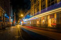 Winkelstraat Leidsestraat bij nacht en een passerende tram