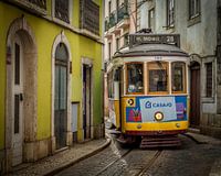 Bekende tramlijn 28 door de straten van Alfama in Lissabon