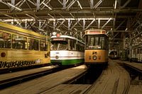 Nostalgische trams staan buiten dienst in rijen op rails opgesteld in de hangar van het trammuseum te Rotterdam...