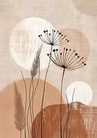 Tranquil Dawn in Abstract - Dit abstracte schilderij toont een minimalistische weergave van planten en bloemen tegen een gestructureerde achtergrond. Op de voorgrond zijn verschillende lineaire elementen zichtbaar die lange grassprieten en delicate dillebloemen voorstellen. Deze zijn uitgevoerd in diepzwart waardoor ze sterk contrasteren met de zachtere achtergrond. De bloemen bestaan uit sierlijke bollen waarvan de takken uitwaaieren en eindigen in kleine bolletjes, wat een speelse dynamiek toevoegt aan het werk. De achtergrond is een harmonieuze compositie van organische ronde vormen en subtiele textuur in tinten beige, crème en zachtbruin. De grote cirkelvormige elementen, uitgevoerd in wittige en roze tinten, overlappen elkaar en creëren een gevoel van diepte en volume. Dit abstracte natuurtafereel is uitgevoerd in een beperkt kleurenpalet, wat bijdraagt aan de rustige en serene uitstraling.