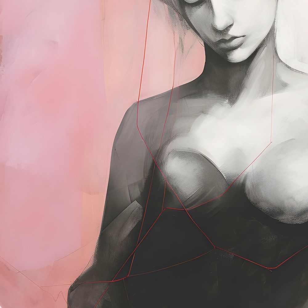 Een portret van een vrouw in rustgevende roze en grijze tinten.