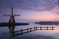 Molen 'De Helper' tijdens een rustgevende zonsondergang aan een spiegelglad Paterwoldsemeer.