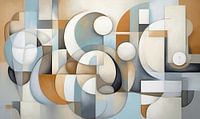 Abstracte collage in zachte aardetinten en pastelkleuren.