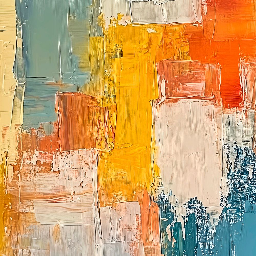 Een levendig abstract kunstwerk met een mix van zachte tinten, de compositie wordt gekenmerkt door gestructureerde penseelstreken en overlappende kleurvlakken die een dynamische visuele aantrekkingskracht creëren. De algehele sfeer is modern en kleurrijk en roept een gevoel van warmte en energie op.