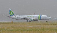 Transavia Boeing 737-800 landt tijdens sneeuwbui.