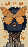 Surrealistische compositie waarbij het gezicht van een persoon wordt gedomineerd door een enorme vlinder die als een masker fungeert. De vlinder, met vleugels in warme oranje tinten en delicate patronen, staat centraal in de compositie en trekt onmiddellijk de aandacht. Het gezicht van de persoon is donker en contrast rijk, wat de…