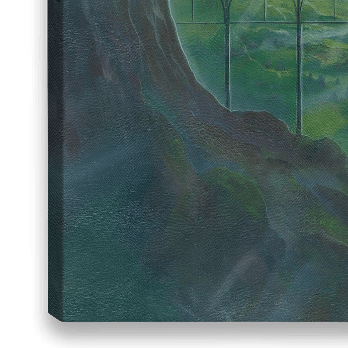 Dit schilderij toont een fascinerend landschap dat de kijker meeneemt naar een wereld vol contrasten en mogelijkheden. Op de voorgrond strekt zich een sombere, rotsachtige aarde uit die bijna surrealistisch en onherbergzaam lijkt. Een sombere vijver zonder weerspiegeling versterkt het gevoel van afzondering en verlatenheid. Deze…
