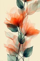 Een etherisch kunstwerk waarin delicate bloemen en bladeren in koraalrode en diepgroene tinten samensmelten in een transparante, dromerige compositie. De zachte overgangen en overlappende lagen creëren een gevoel van beweging en lichtheid, waarbij de natuurlijke vormen lijken te zweven tegen een lichte achtergrond.