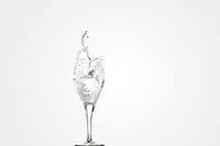 Het met water gevulde wijnglas op witte achtergrond is hard neergezet en hierdoor zie je de vloeistof uit het glas springen.
