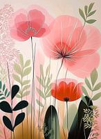 Stijlvolle, gestileerde afbeelding van bloemen en planten. De compositie is luchtig en verfijnd, met transparante, roze klaprozen die prominent aanwezig zijn tegen een zachte, neutrale achtergrond. De bloemen zijn groot en opvallend, hun doorschijnende bloemblaadjes geven een gevoel van delicatesse. De centra van de klaprozen zijn donkerder en gedetailleerder, wat een mooi contrast vormt met de lichte bloemblaadjes.