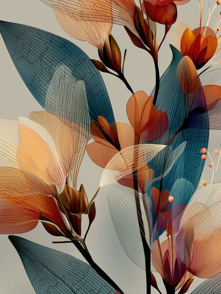 Lelies, Oranje, Turquoise, Transparant, Botanisch, Bloesems, Modern, Lichtgevend, Contrast, Elegant, Lijnen, Textuur, Kleurenharmonie, Gestileerd, Decoratief