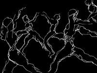 Lijntekening. Schildering in wit op zwart canvas van dansende, bewegende, feestende mensen in de nacht.