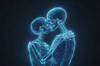 De röntgenfoto toont een koppel dat elkaar innig omhelst, hun lichamen afgebeeld in een betoverend spel van licht en schaduw. De doorschijnende silhouetten van de twee mensen onthullen de contouren van hun lichamen en de delicate details van hun omhelzing. De röntgenfoto's onthullen niet alleen hun fysieke nabijheid, maar ook de emotionele band tussen hen. Hun armen zijn stevig om elkaar heen geslagen en geven een gevoel van bescherming en geborgenheid. De compositie legt het moment van intimiteit vast en laat de kijker de diepte van hun relatie voelen. Het is een indrukwekkende weergave van liefde die verder gaat dan het zichtbare en de onzichtbare banden tussen de twee mensen visualiseert.