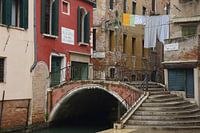 Een brug, een stenen trap, oude huizen in pastelkleuren en hangende was in Venetië, Italië.